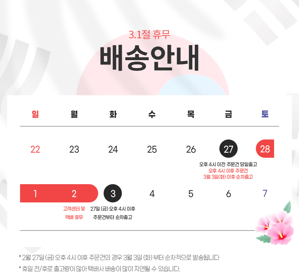 배송마감은 월~금요일(평일) 오후 4시(입금 확인 건에 한해 당일 배송) / 토~일요일 주문 시 월요일(공휴일일 경우 다음 영업일) 배송됩니다.